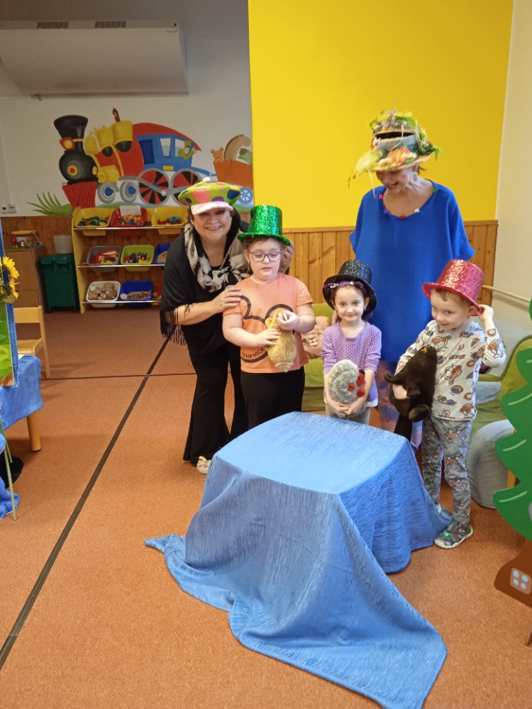 Pravidelně nás ve školce navštěvuje divadlo Leonka s veselými pohádkami, do kterých se zapojují zpěvem nebo tancem také děti.