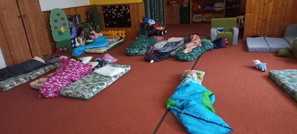 Děti, které se už se školkou loučí, si každoročně ještě vyzkouší přenocovat v MŠ. Letos si předškoláci si užili slavnostní večeři v restauraci, pyžamovou diskotéku a nocleh ve spacáku.